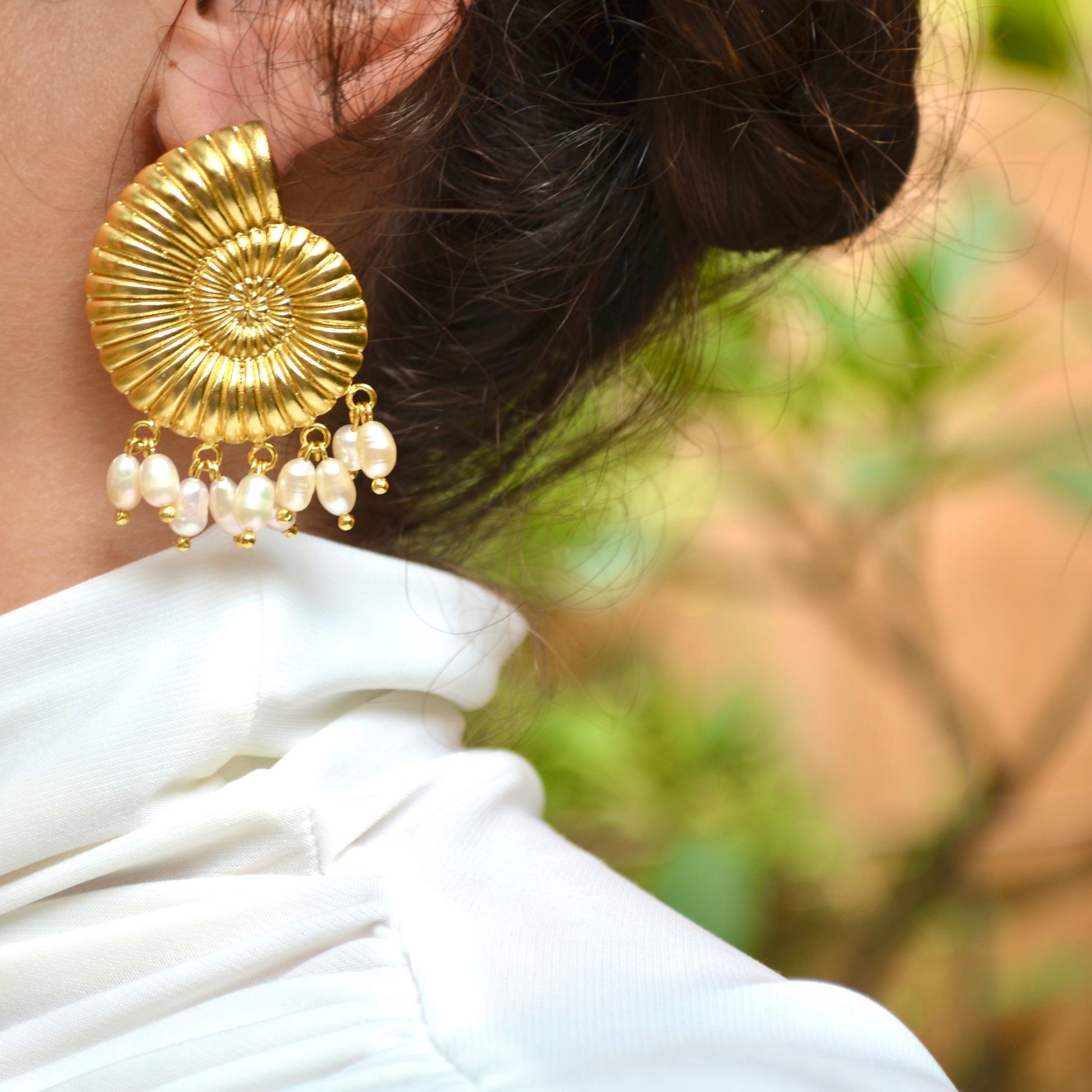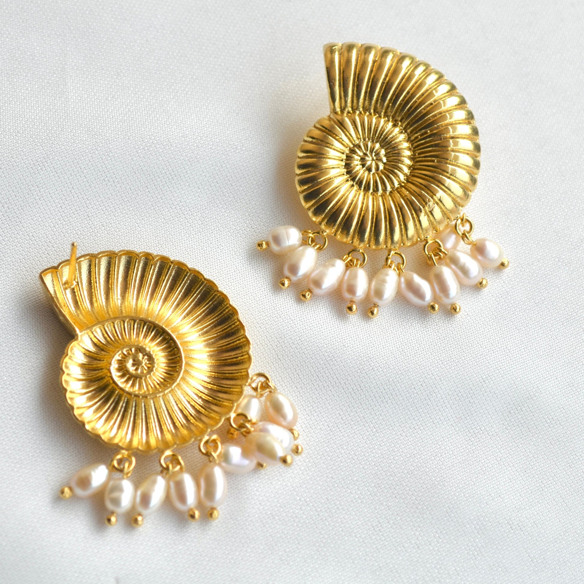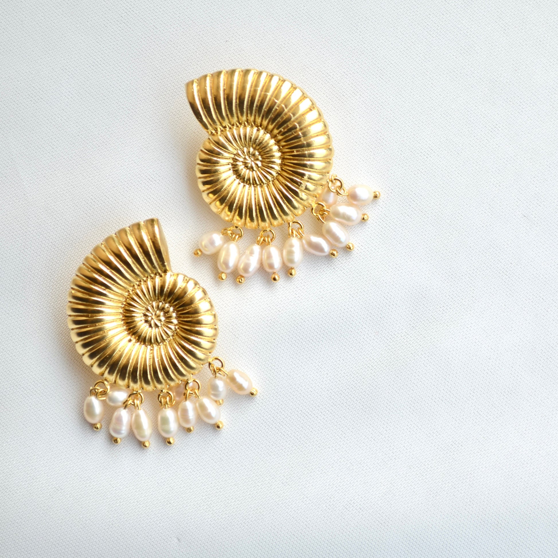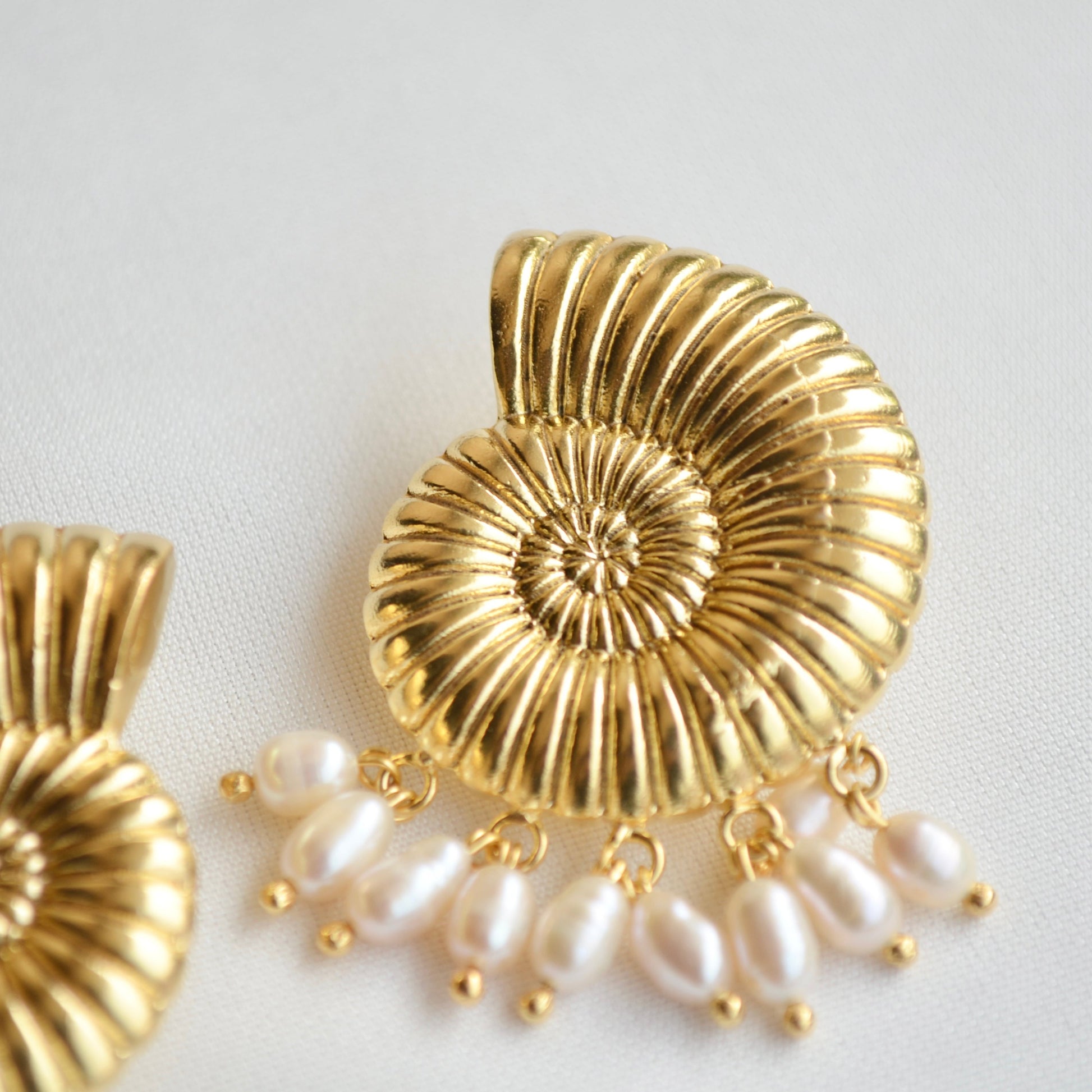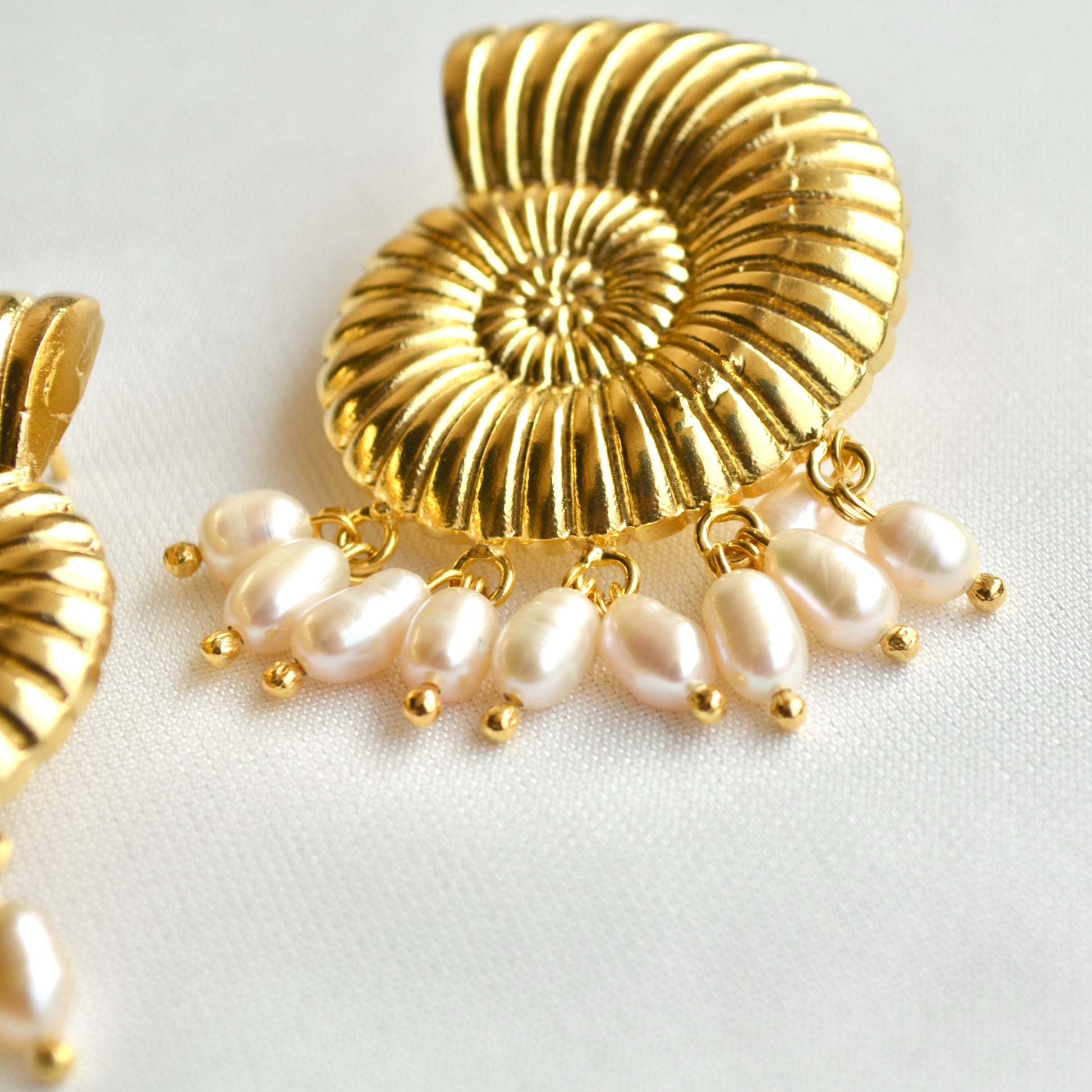 Tam bir ''wow'' küpe. Takın, çıkın ve günün yıldızı siz olun. Şıkır şıkır inciler ve deniz kabuğunun uyumu bu tasarımda resmen takan kişiyi büyülüyor.